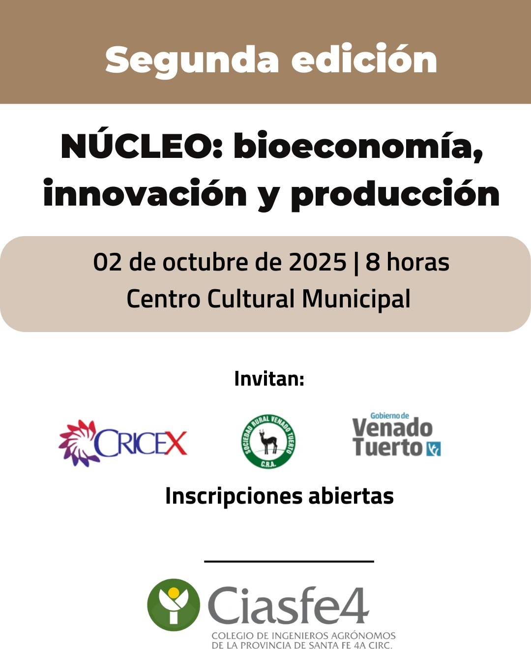 Es un placer para el Gobierno de Venado Tuerto, la Cámara Regional de Industria y Comercio Exterior del Sur de Santa Fe (CRICEX) y Sociedad Rural de Venado Tuerto (SRVT) invitarlos a participar en la segunda edición del “Núcleo: Bioeconomia, Innovacion y produccion” que se llevará a cabo en nuestra ciudad.